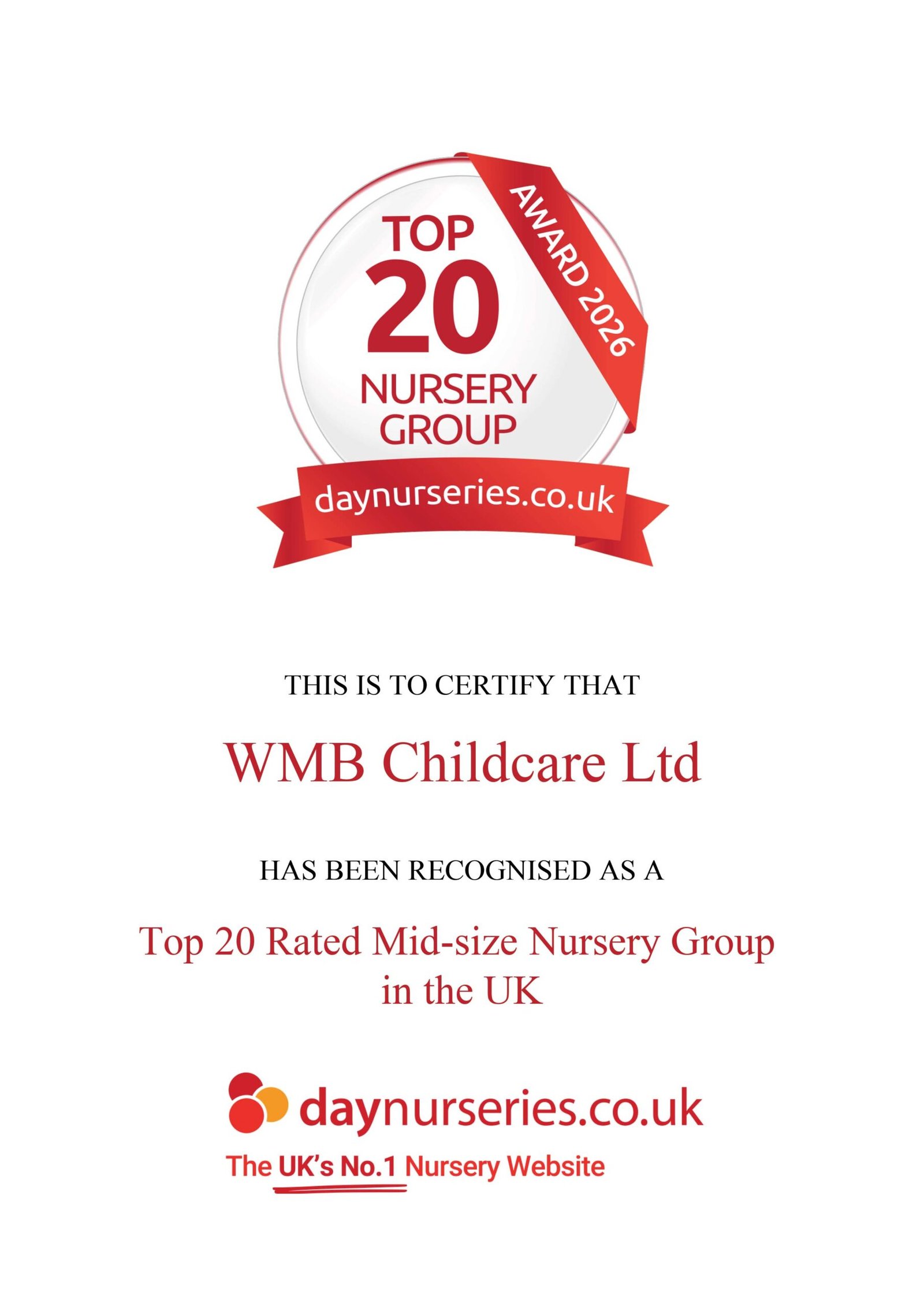 We are incredibly proud to share that daynurseries.co.uk has recognised WMB Childcare Ltd as one of the Top 20 Rated Mid-size Nursery Groups in the UK a prestigious honour from the country’s leading nursery review platform.